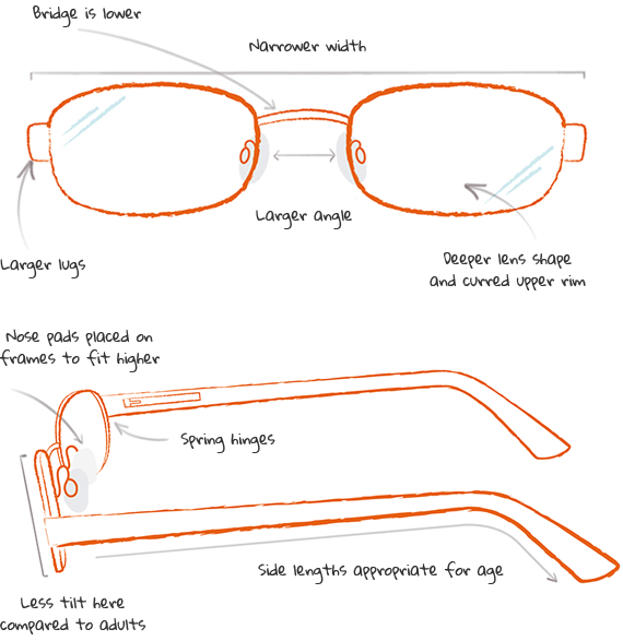 Our children’s glasses are not just smaller versions of adults’ styles. We spend a lot of time deciding on what frames we have in our children’s glasses ranges that are specifically designed for children. So as well as looking good, they have a number of features that take into account your child’s anatomy and head shape and the fact that they are likely to grow during the time they own them.