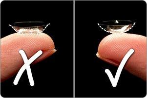 If the lens is inside out, place it in the palm of your hand, add a few drops of solution and gently turn the lens the right way round